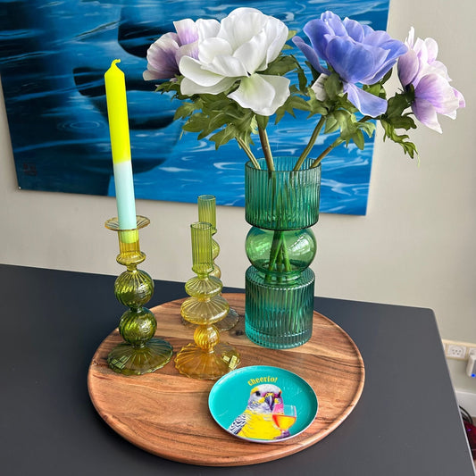 Glazen kandelaar in diverse groen tintenDeze kandelaar met de mooie groentinten is zo mooi v verfijnd!Nog 5 op voorraad! Glazen kandelaar in diverse groen tintenDeze kandelaar met de mooie groentinten is zo mooi v verfijnd!Normale prijs Vanaf €19,95Normale prijsEenheidsprijs / per-