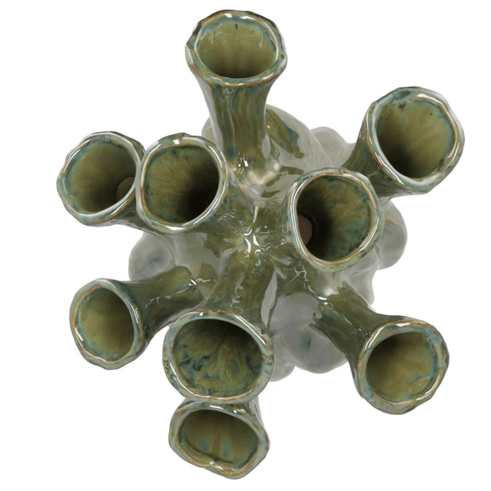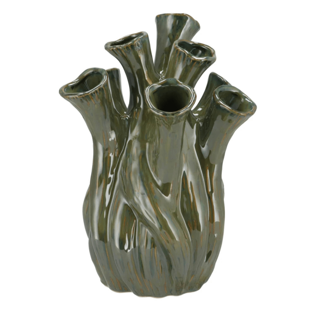Wat een leuke en bijzondere vaas is dit! Deze groene aglio vaas valt meteen op door zijn speelse, organische vorm. De vaas bestaat uit 9 losse tubes waar je bloemetjes in kunt steken. Superhandig als je niet zo van het bloemschikken bent – je zet gewoon een paar mooie bloemen in de buisjes en het ziet er meteen leuk uit.