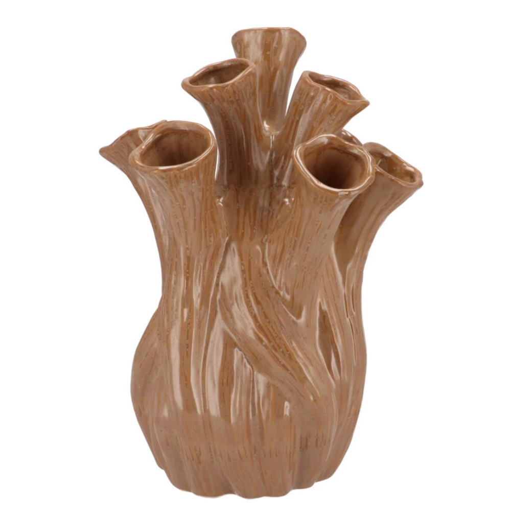 De vaas is 29 cm hoog en heeft een warme, bruine kleur met een subtiel glanzend laagje. Die kleur past goed bij natuurlijke tinten en combineert mooi met hout, linnen of andere aardse materialen. Door de speelse vorm is het ook zonder bloemen al een leuke blikvanger.