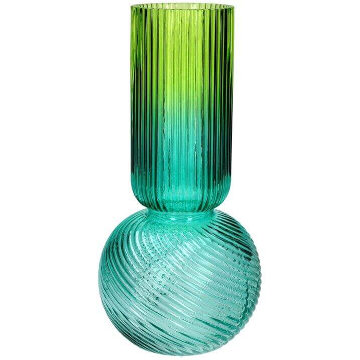 Breng kleur in je interieur met deze prachtige glazen vaas van 30 cm hoog. De vaas heeft een opvallend ontwerp in groen en blauw, waarbij de kleuren mooi in elkaar overlopen. Het bovenste deel is voorzien van een stijlvol geribbeld patroon, terwijl de ronde onderkant een sierlijk swirlmotief heeft. Een mooie combinatie van modern en tijdloos design.