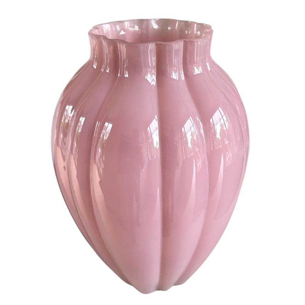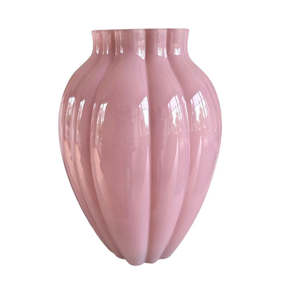 Breng elegantie en zachtheid in je interieur met deze oudroze glazen vaas. De opvallende geribbelde vormgeving in combinatie met de glanzende afwerking maakt dit decoratieve item tot een echte blikvanger. De subtiele glans laat het licht prachtig reflecteren en geeft de vaas een levendige, luxe uitstraling.