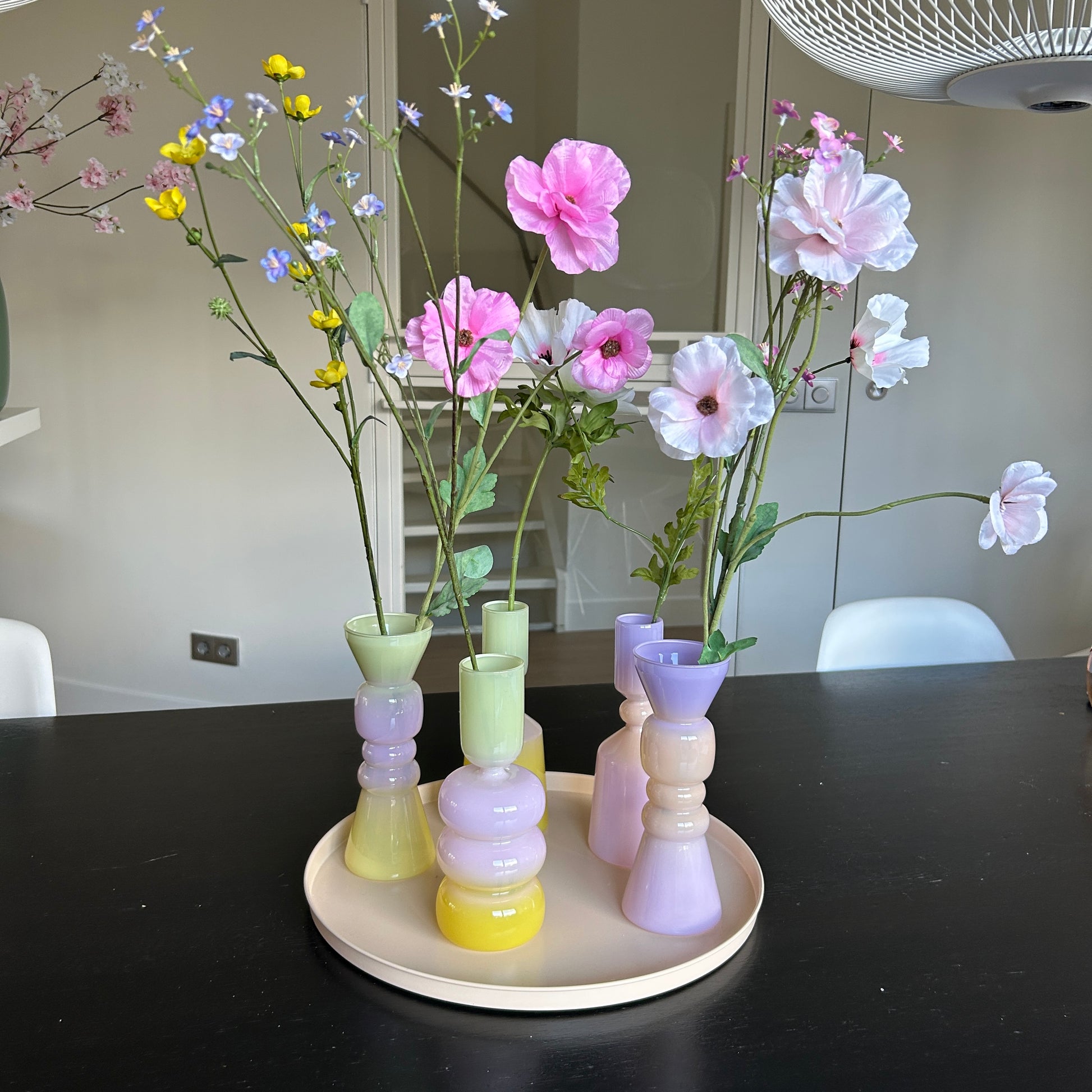Breng zachtheid en kleur in je interieur met deze prachtige glazen vaasjes in pastelkleuren. Verkrijgbaar in diverse tinten zoals zacht geel, lila, groen en perzik, straalt deze vaas een frisse en speelse sfeer uit.