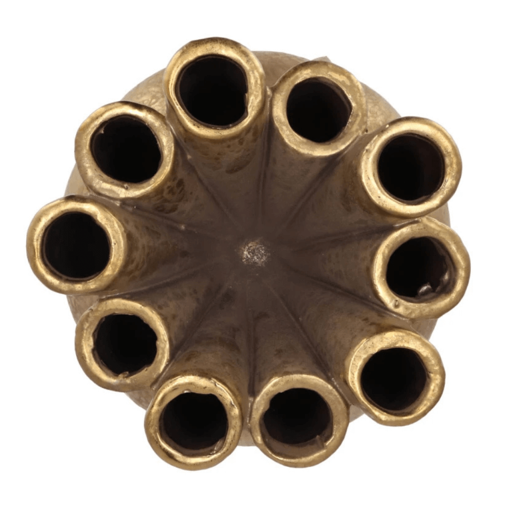 Ben je niet zo’n held in bloemschikken? Geen probleem! Met deze gouden tubevaas zet je toch moeiteloos een prachtig boeketje neer. De vaas heeft maar liefst 10 openingen, dus je kunt elk bloemetje apart in een eigen opening zetten. Zo blijft alles mooi op z’n plek en ziet het er altijd goed uit – zonder gedoe.
