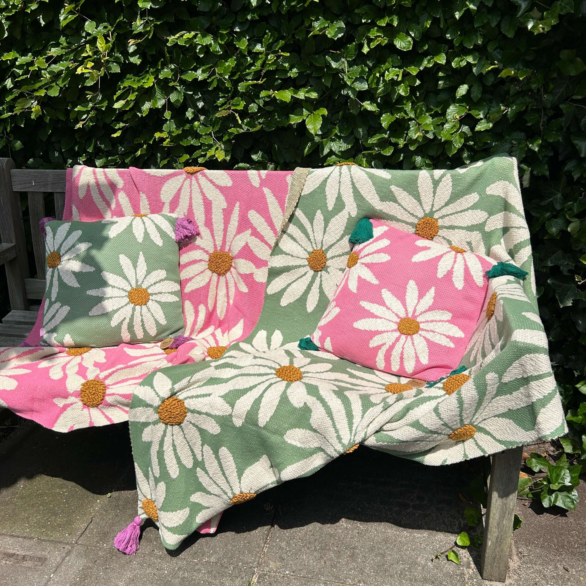 We zijn dol op deze prachtige, gebreide deken in een mooie groene kleur met bloemen en paarse kwastjes. Dit plaid voegt kleur en gezelligheid toe aan elk interieur. Het speelse bloemenpatroon, gecombineerd met de leuke paarse kwastjes, maakt dit een echte eyecatcher in je huis.