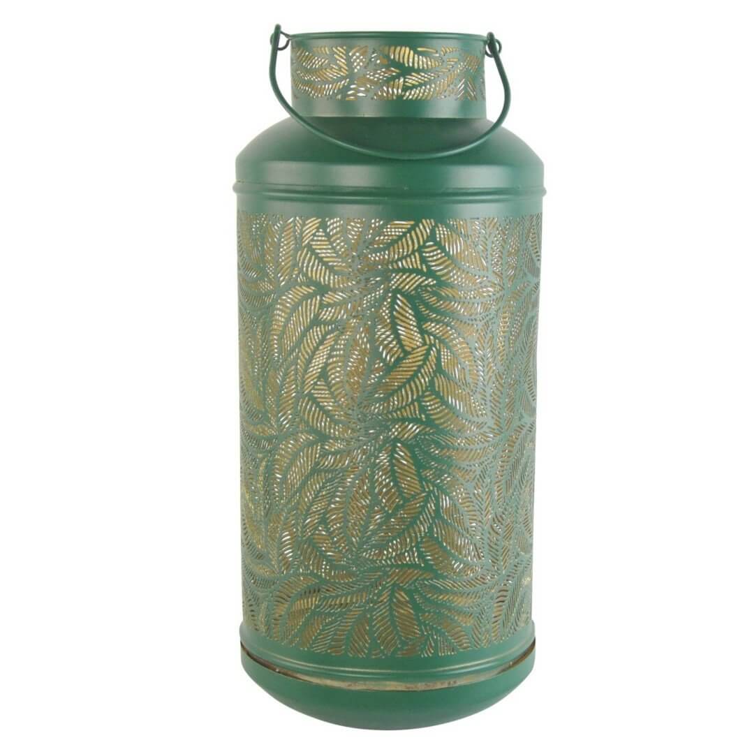 Deze grote, goenkleurige lantaarn is een echte sfeermaker in huis. Hij is gemaakt van metaal en heeft een opengewerkt bladmotief waardoor het kaarslicht prachtig wordt verspreid. Met een hoogte van 41 cm en een breedte van 16 cm is het een opvallend stuk dat goed tot zijn recht komt op tafel, op de vloer of in een vensterbank.