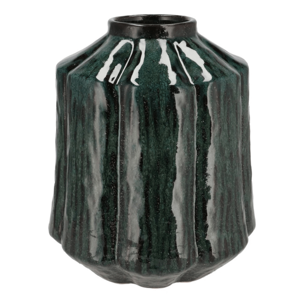 Deze groene keramieken vaas is een echte blikvanger in huis. De mooie geglazuurde afwerking geeft een speels en natuurlijk effect, en de vorm is net even anders dan anders. Hij is verkrijgbaar in twee handige maten: 25 cm of 31 cm hoog. Zo kun je kiezen wat het beste past op jouw tafel, kast of vensterbank.