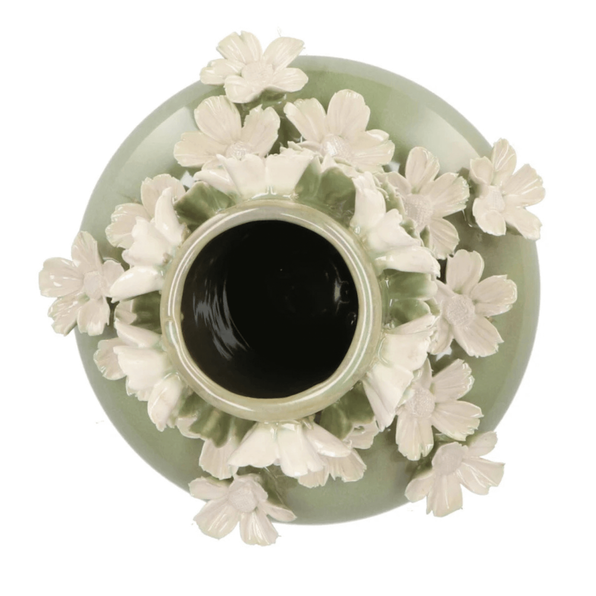 Een bijzondere vaas in een zachte groene kleur, versierd met keramieken bloemsculpturen die rondom de hals omhoog komen.