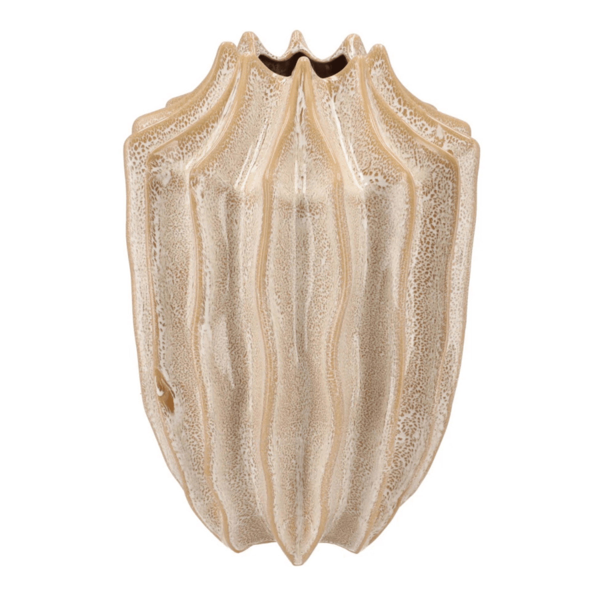 Deze keramieken vaas is 37 cm hoog en heeft een warme zandkleur met een mooie golvende vorm. De licht glanzende afwerking en het speelse patroon geven de vaas een unieke uitstraling.