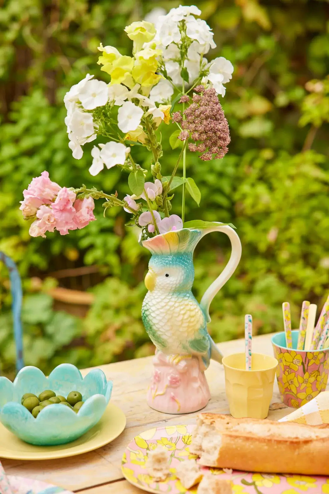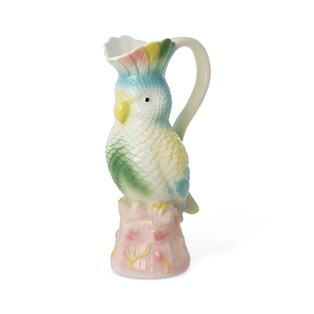 Geef je tafel een vrolijke en unieke uitstraling met deze prachtige keramieken waterkan in de vorm van een exotische vogel. Met zijn kleurrijke en speelse ontwerp tovert deze kan gegarandeerd een glimlach op ieders gezicht. Perfect voor het schenken van water, limonade op een warme zomerdag, of zelfs als een opvallende vaas voor bloemen. Deze veelzijdige kan is niet alleen praktisch, maar ook een echte eyecatcher in je interieur.
