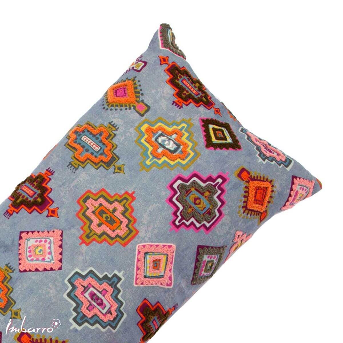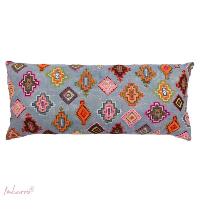 Geef je bank, bed of favoriete fauteuil een frisse en speelse upgrade met dit langwerpige kussen van Imbarro. De prachtige blauwe ondergrond is versierd met een bonte mix van geometrische figuren in oranje, roze, wit en geel – een echte blikvanger! De achterkant is effen van kleur en de hoes is voorzien van een handige rits.