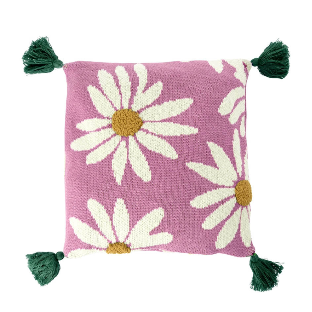 Dit sierkussen van het merk RICE is een prachtige aanvulling voor je interieur of tuin. Het kussen heeft een roze achtergrond met een vrolijke madeliefjesprint en groene kwastjes aan de vier hoeken. Het zorgt voor een gezellige en kleurrijke sfeer, of je het nu binnen op de bank legt of buiten op een stoel.