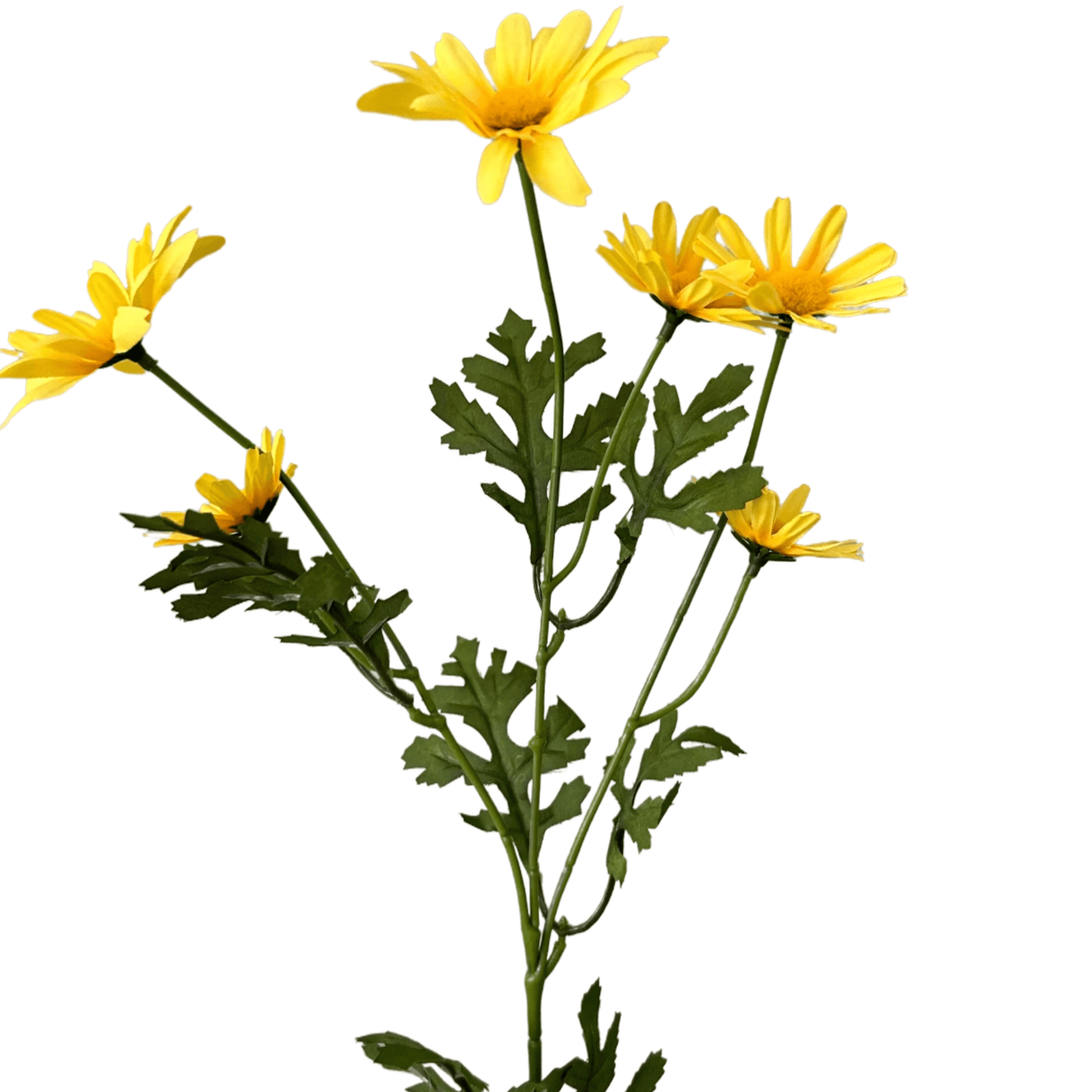 Met hun gele bloemblaadjes en zonnige gele hart voegen deze margrieten een relaxte, zorgeloze sfeer toe aan elke ruimte. Ze zijn 70 cm hoog, dus ze vallen zeker op, en er zitten genoeg margrieten aan elke tak om een echt buitengevoel te creëren.